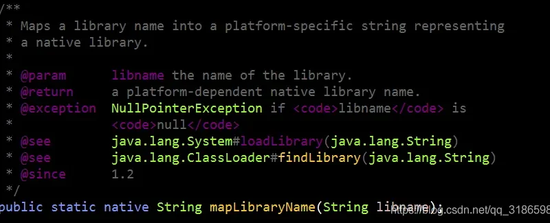 System.mapLibraryName是一个本地方法,表示将库名映射成特定平台下的库文件名,定义如下: